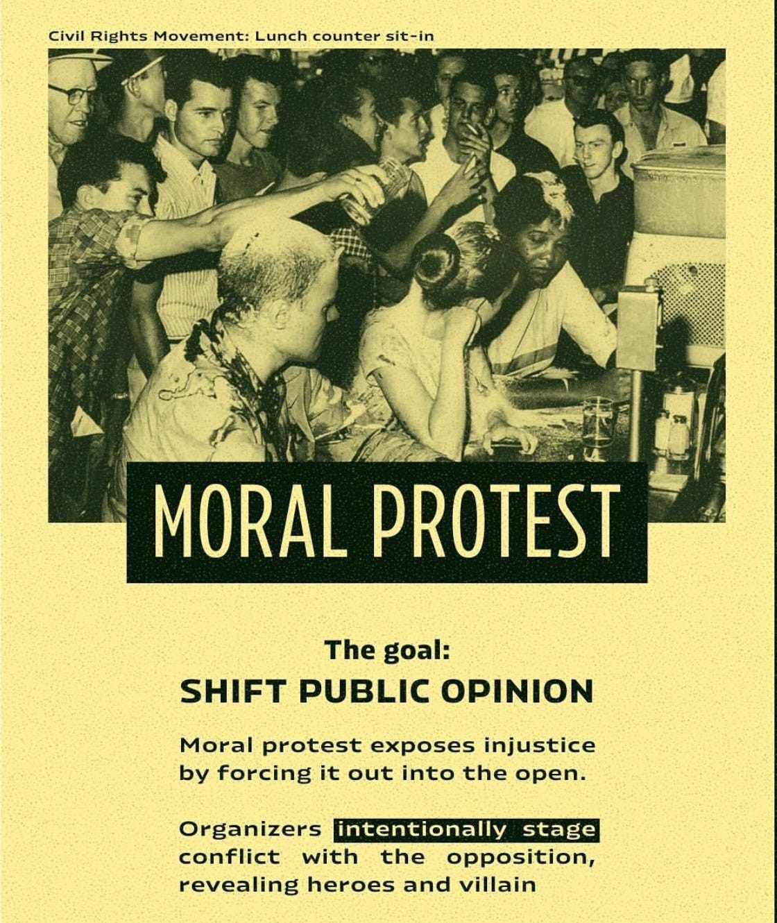 For example: The lunch counter sit-ins during the Civil Rights Movement were a moral protest. Activists sat at "whites only" lunch counters and endured harassment from white customers. This peaceful protest (at least on the activists' side) illustrated to the world which side was actually immoral.