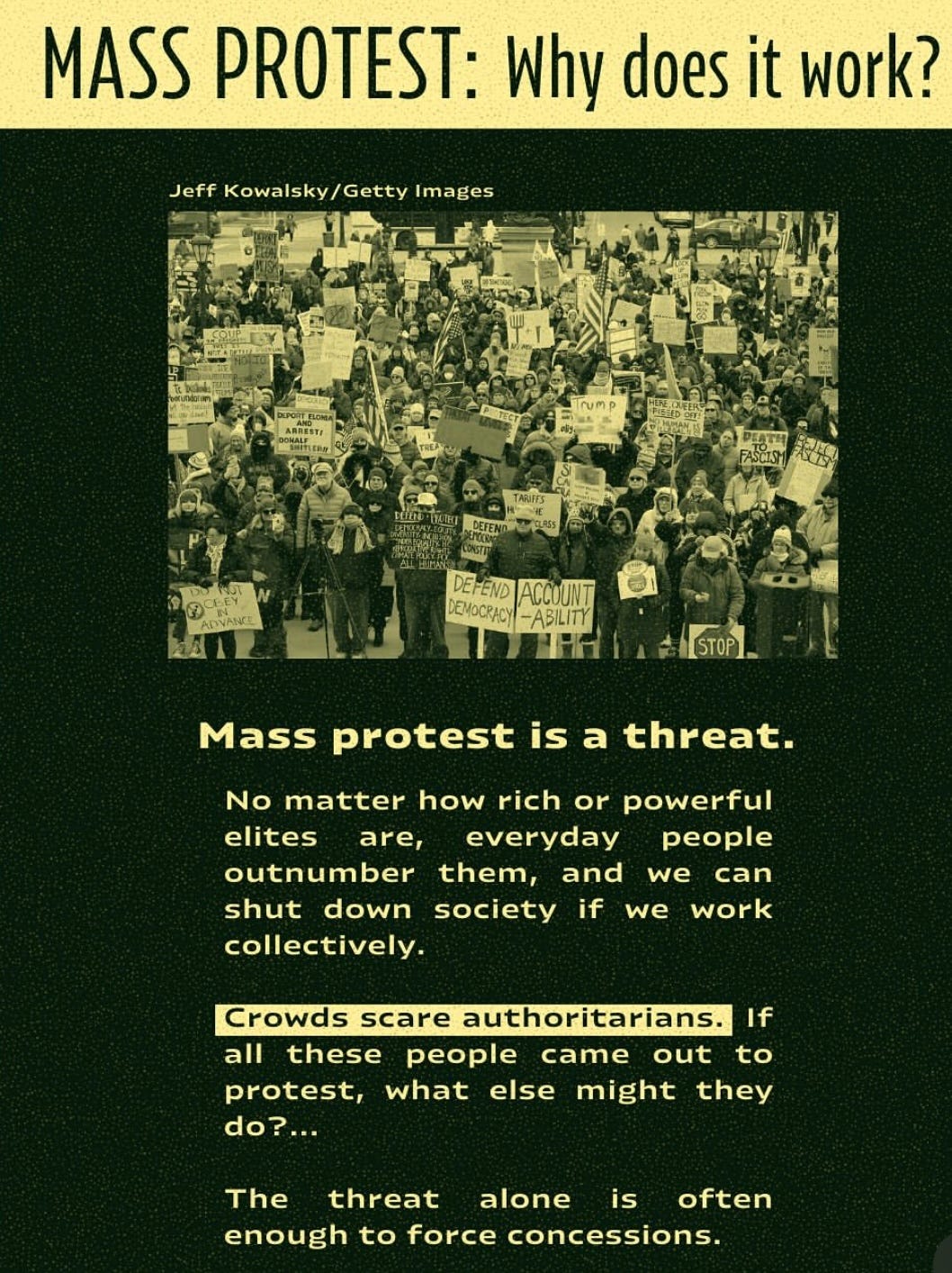 A single march won't make a difference, true. But sustained, strategic nonviolent protest movements absolutely work. See: The American civil rights movement, India's independence movement, the end of apartheid in South Africa... Chile, Serbia, Poland, Georgia, Phillippines, I could go on! We can make April 5 Day One of a sustained protest movement, or we can decide we will fail before we even try.