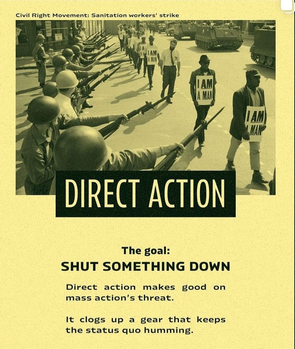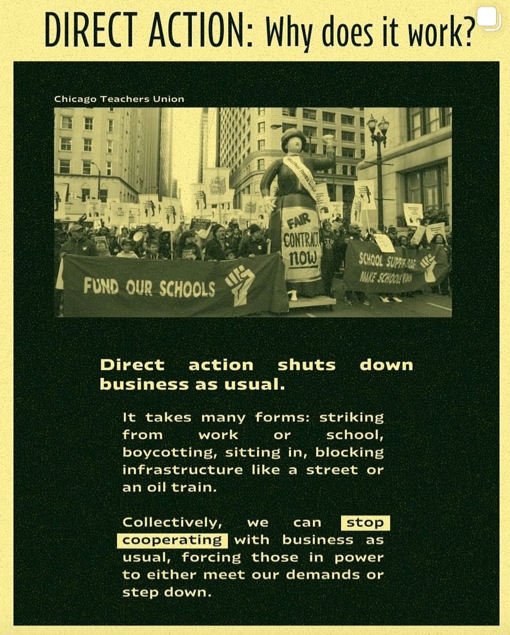 Direct action is what many people think of when they imagine a protest. Think: Walking out of work for a workers' strike, protestors blocking a highway or occupying a building, etc. It is an action that literally prevents business from continuing as usual.