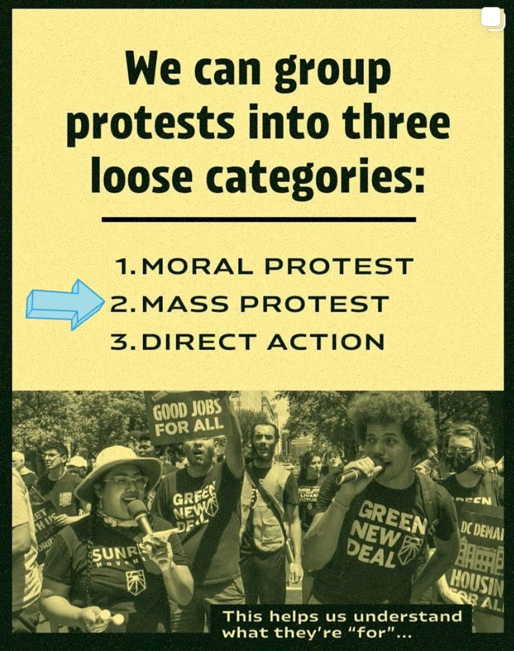 Other types of protests have different tactics and goals. For example: moral protests and direct action.